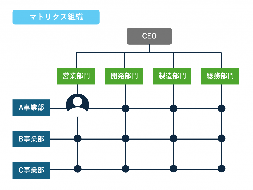 マトリクス組織とはマトリクス図のように、複数の軸(営業や開発など)の組み合わせにより、網の目状に構成された組織形態のことです。一般的な例として、従業員は一つの部署に所属し業務を行いますが、マトリクス組織では別の軸(地域や製品など)の事業にも所属します。たとえば軸の要素が「営業」と「製品」で構成されている場合、縦軸の「営業」部門に従事しますが、同時に横軸の「製品」事業にも従事します。