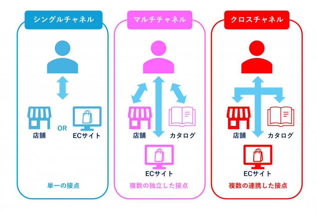 クロスチャネル(英:Cross-Channel)は複数のチャネルによって構築されたうえで在庫や顧客情報が連携しているチャネル構成です。情報はリアルタイムに更新されるため、ECサイトに在庫はあっても実店舗にはない、というような販売機会損失の防止を期待できます。