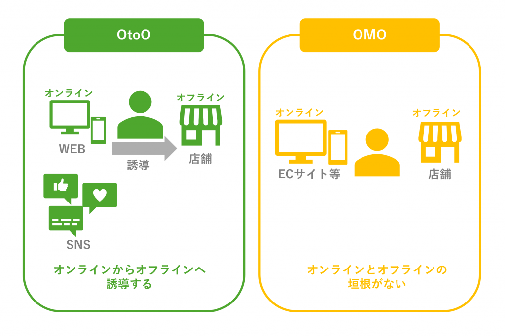OMO(英:On-line Merges with Off-line)はオンラインとオフラインを区別せずに結び付け、チャネルの違いを感じさせずにサービスを利用してもらう施策のことです。一例としてアプリケーションを利用したモバイルオーダーで、行列や待ち時間によるストレス解消を試みる施策が挙げられます。