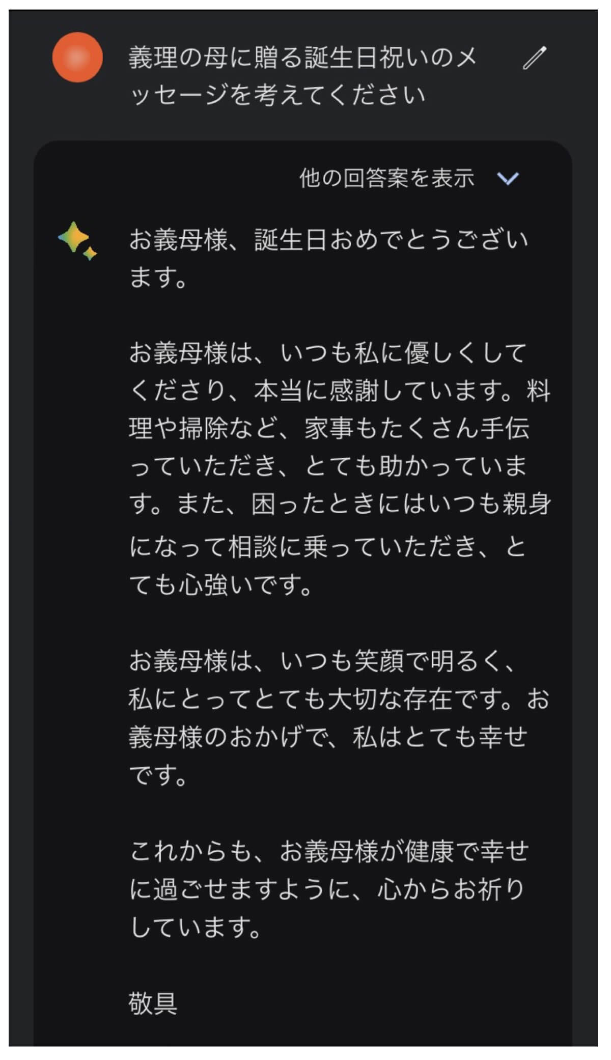 また、日本語のこなれ具合を見ると、Google Bardのメッセージはあまり違和感がありません。一方ChatGPTは「親愛なる義理の母へ」や「愛をこめて」など、日本人はあまり日常的には使わない表現が目につきます。