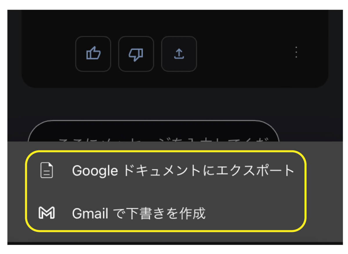 これをタップすると「Googleドキュメントにエクスポート」か「Gmailで下書きを作成」を選ぶことができます。