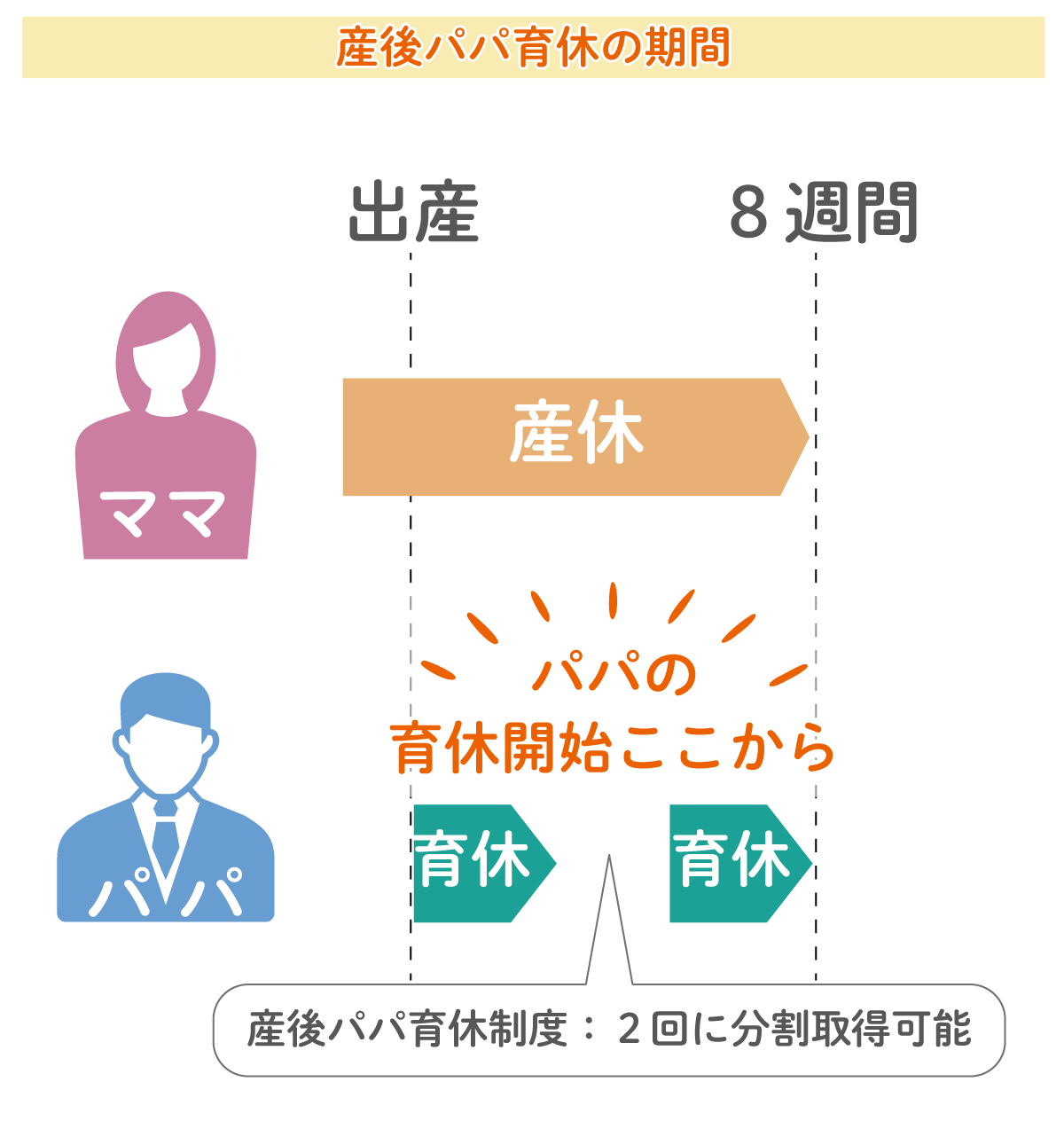 産後パパ育休とは、子どもの出生後8週間以内に最大4週間の育休を2回に分けて取得できる制度です。育児休業制度と産後パパ育休はあわせて取得できます。