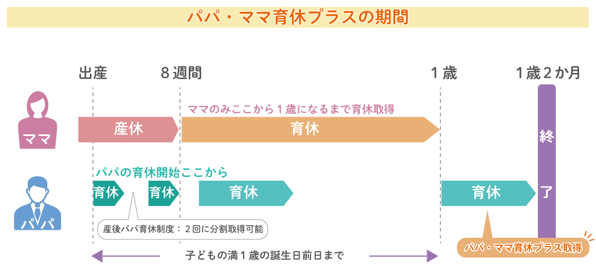 パパ・ママ育休プラスとは、パパ・ママ双方が育休を取得した場合に、その期間を1歳2か月まで延長できる制度です。ただし、個人の育休期間はそのままですので、分割して取得することをおススメします。