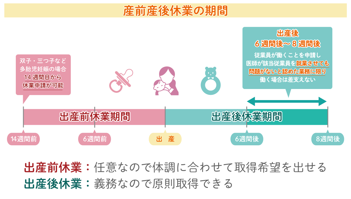 | 産前(任意) | 休業目的:出産前準備 期間:出産予定日前6週間(多胎児の場合は14週間) 体調により取得しなくてもよい |