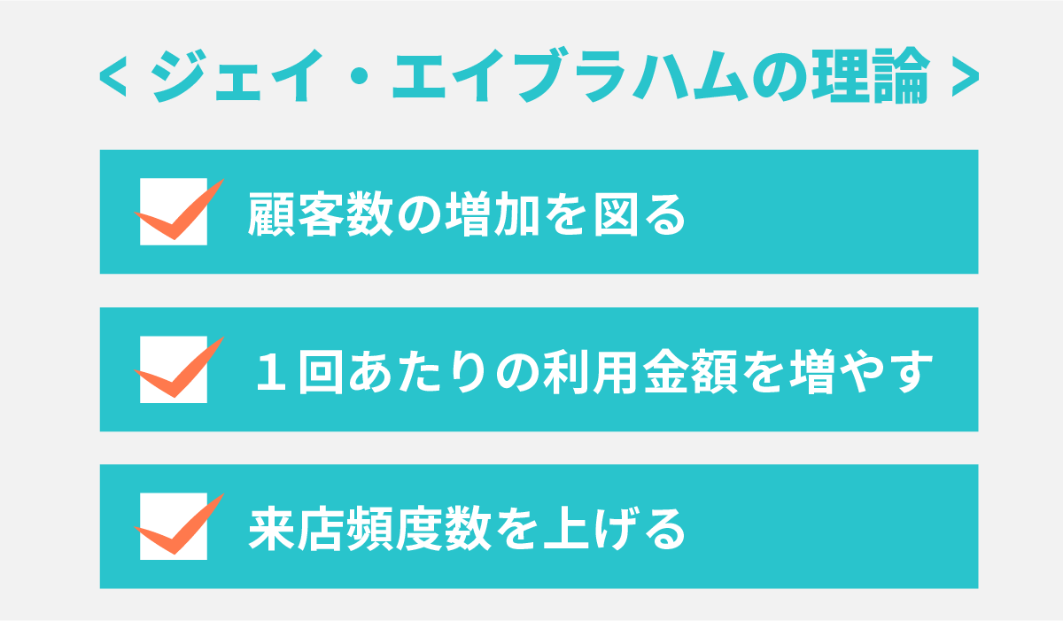 売上は、顧客数×客単価×購入頻度という単純な計算で算出できますので、売上拡大は一番ポピュラーな問題です。アメリカの著名な経営者でありマーケティングコンサルタントでもあるジェイ・エイブラハムの理論でも、この3つのうちいずれかをアップさせればよいと説いています。