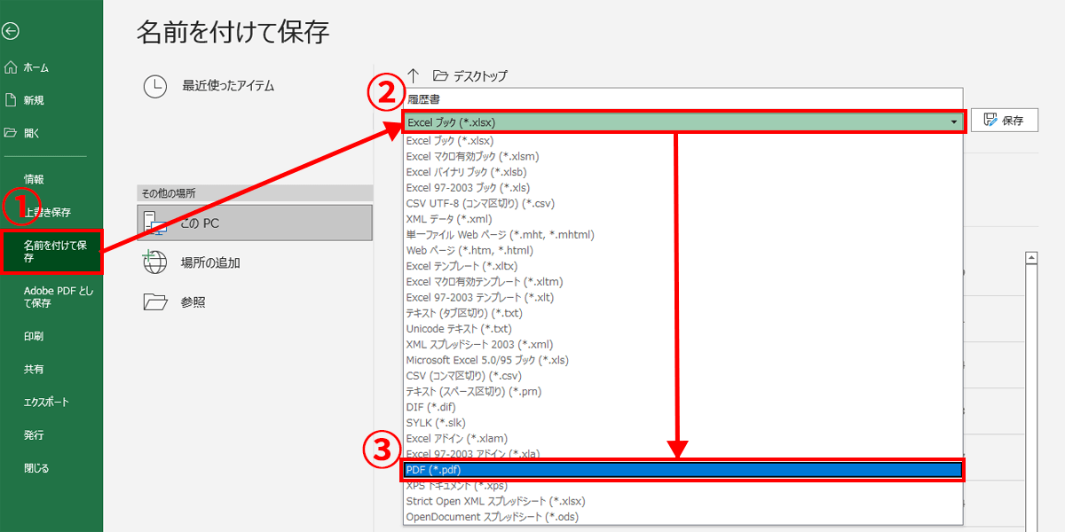 ExcelやWordで作成した履歴書をPDFファイルにする手順です。(以下の画像参照)