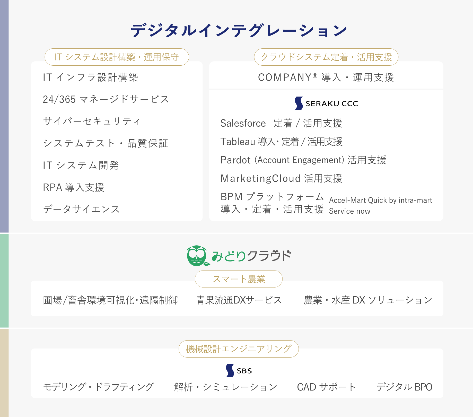 クラウドサービスにおけるカスタマーサクセスソリューションやAI/サイバーセキュリティ/RPAなどの先進技術で企業のデジタル化を支援するDX(デジタルトランスフォーメーション)サービス、企業のITインフラやITシステムを支えるSI(システムインテグレーション)サービス、農業IoTサービス「みどりクラウド」等を提供しています。