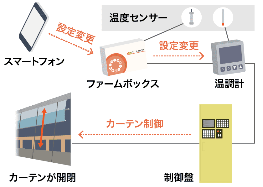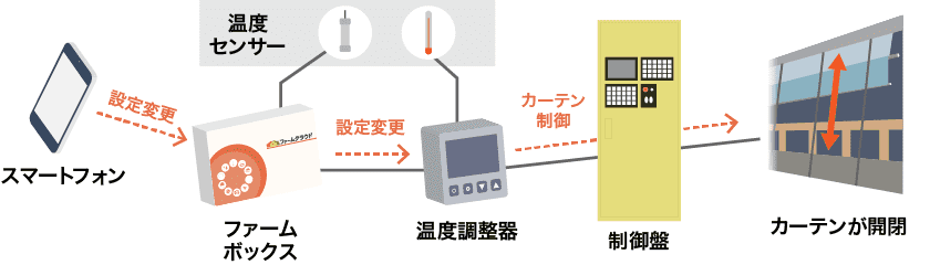 従来の温度調整器・制御盤にファームボックスを接続することで、遠隔からカーテンの開閉温度の調整などの操作を実行できるようになります。