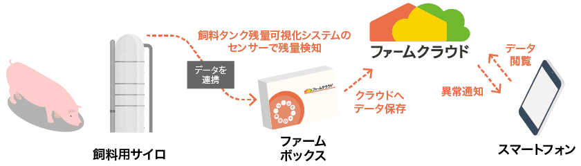 飼料の適切な管理、並びに管理業務の省力化が残量モニタリングシステムと連携したファームクラウドの活用で可能になります。