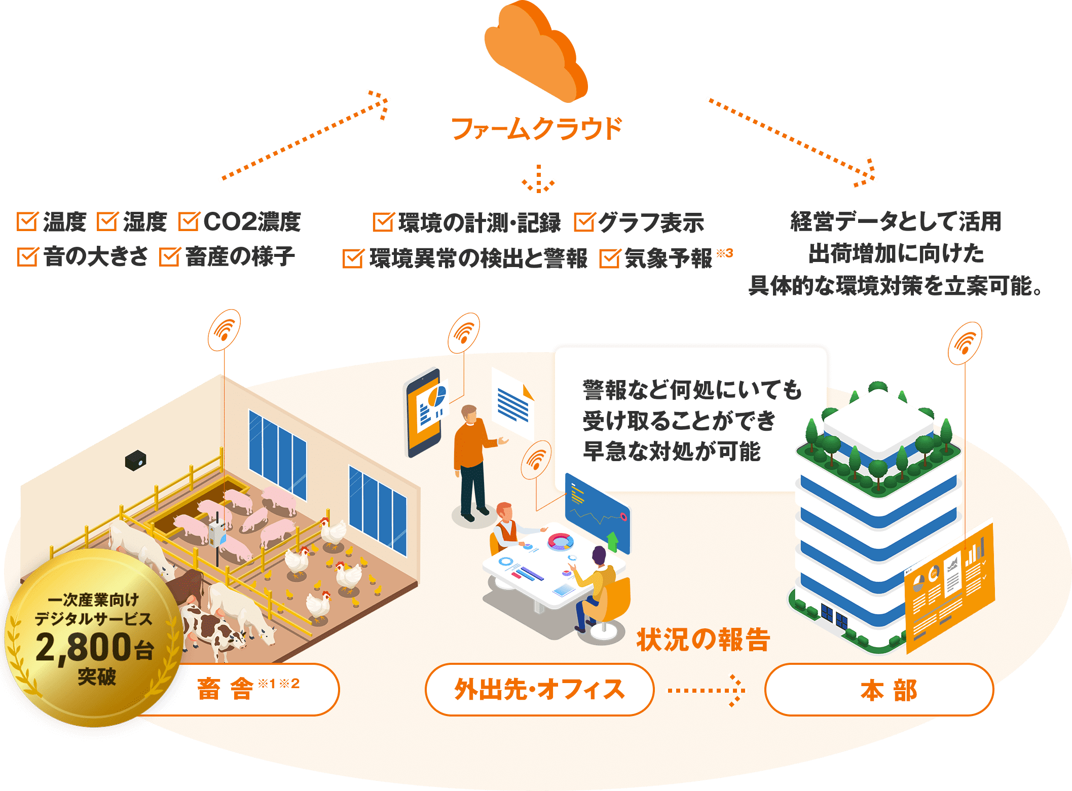 温度、湿度、CO2濃度、騒音、家畜の行動を自動的に計測し、そのデータをPCやスマートフォンで確認することができます。 -