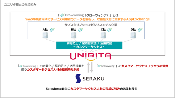 〜 SERAKU Customer success for ISV Partnersをリリース ~ 株式会社セラク(東京都新宿区、代表取締役:宮崎⿓⼰、東証一部上場(証券コード6199)、以下「当社」)は、Salesforce AppExchange向けのカスタマーサクセスサービス『SERAKU Customer success for ISV Partners』開始し、専門の部門を新設いたしました。 ■ Salesforce AppExchange「Salesforce AppExchange」はSalesforceプラットホームで構築されているクラウドサービスや、Salesforce機能を拡張するために提供されているアプリケーションを紹介している世界最高水準のビジネスアプリのマーケットプレイスです。 グローバルでは、4,900以上のAppExchangeアプリがリリースされており、お客様は業務に必要なアプリを選び、システムを拡張することができます。 ■ リリースの背景AppExchangeベンダー(ISVパートナー)では製品の企画、開発、販売は行うものの、初期にかかる導入設定作業やその後の活用はユーザに委ねられているケースが多く存在しており、結果として顧客が利用開始に踏み切れないことや、導入したまま活用されずに最悪のケースは解約に至るケースがありました。 また、新たにSalesforce AppExchangeを開発し、ISVパートナーを目指す際も同様で、製品の企画、開発、販売は自社で対応するイメージが持てるものの、事業としてスケールする前から自社のリソースで導入から定着化・活用支援を行う組織やリソースを持つ事業リスクもありました。 セラクはこれまで、Salesforceプラットホームに関して250社以上の定着・活用の支援を行ってきました。その中でユーザ側に立ち、Salesforce AppExchangeの選定から導入・定着活用を支援するケースも少なくありませんでした。 当社としてはSalesforceを利用するユーザ企業だけでなく、Salesforceの活用を後押しするAppExchangeベンダー(ISVパートナー)の支援をすることで結果としてユーザ企業のさらなるSalesforce活用を促進できると考えています。 ■ SERAKU Customer success for ISV Partnersのサービス提供イメージ ■ サービスメニュー ■ユースケース 株式会社ユニリタが提供しているAppExchangeである「Growwwing」のカスタマーサクセス組織を共同で開発しています。 ■ エンドースメント 株式会社セラク様の「SERAKU Customer success for ISV Partners」の提供開始を心より歓迎いたします。 サブスクリプション型ビジネスおいて、安定的な売上を得るためには、カスタマーサクセスは必要不可欠な要素です。 多くのお客様をご支援してきたセラク様がカスタマーサクセスのノウハウを提供されることは大変有意義なことと考えております。 当社も、Salesforce上で稼働するカスタマーサクセス管理サービス「Growwwing」を提供しており、両社が連携することによって、より多くのお客様の事業の成功にむけてご支援して参ります。 株式会社ユニリタ 取締役 常務執行役員 クラウドサービス事業本部長 藤原 達哉 ■関連サービス(Salesforceの定着化・活用支援サービス) 顧客管理(CRM)、営業管理(SFA)、マーケティングオートメーション(MA)プラットホームとして⾼いシェアを持つSalesforceの定着化・活用において重要な提案力×実装力×推進力を兼ね備えた人材がオンサイト型(常駐型)、センター型でSalesforceの定着化・運⽤を⽀援します。 ■株式会社セラクについて 株式会社セラクは、IT技術教育(人材育成)によりビジネスを創造し、社会の発展に貢献するIT企業です。IoT/AI/サイバーセキュリティ/RPAなどの先進技術やSalesforce、デジタルマーケティングなどの高成長領域で企業のデジタル化を支援するデジタルトランスフォーメーション事業(DX事業)、企業のITインフラやITシステムを支えるシステムインテグレーション事業(SI事業)と、農業IoTサービス「みどりクラウド」を提供しています。 ■本件のお問い合わせ先 株式会社セラク 経営戦略室 広報/IR担当 TEL:03-3227-2321