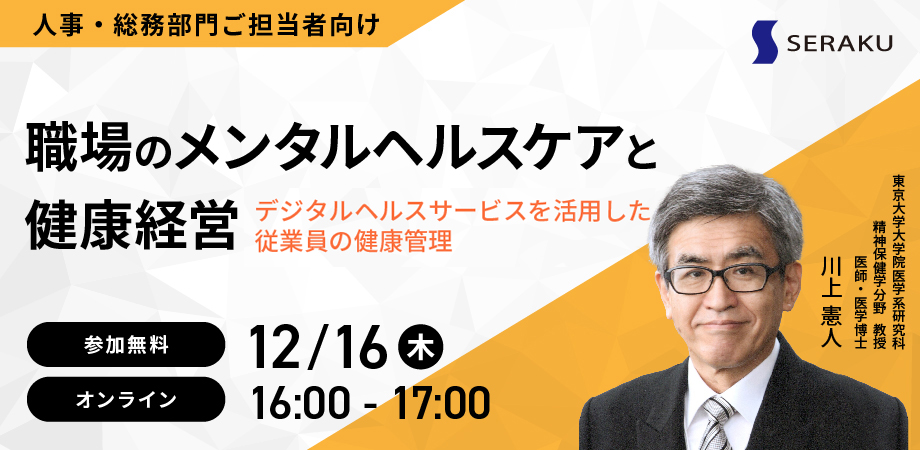 ITソリューションの株式会社セラク(本社:東京都新宿区、代表取締役社長:宮崎 龍己、東証一部上場(証券コード6199)、以下「当社」)は、12月16日(木)に、職場のメンタルヘルスケアと健康経営をテーマにしたオンラインセミナーを開催します。 昨今の働き方改革や新型コロナウイルス対策の一環としてのテレワークの増加など、企業を取り巻く環境は日々変化をしつづけています。このような状況において、従来以上に従業員のメンタルヘルスケアが必要になっています。今回、東京大学大学院 川上憲人教授(医師・医学博士)を講師にお招きし、いま企業に求められているメンタルヘルスケアへの取り組みや健康経営の推進方法についてご紹介します。 【開催概要】 ・日時:2021年12月16日(木) 16:00~17:00 ・場所:オンラインライブ配信(Zoom) ・参加費:無料 【登壇者】 東京大学大学院医学系研究科 川上憲人 教授(医師・医学博士) 公衆衛生学の出身で、主な研究分野は職場のメンタルヘルス、精神保健疫学、行動医学など。 職業性ストレスに関する研究、地域住民の精神保健疫学研究を中心とし、幅広い研究活動を行っている。 【申込方法】 以下ウェブサイトより受け付けています。 https://serakuseminer.peatix.com/?utm_source=pr&utm_campaign=211216b ■株式会社セラクについて 株式会社セラクは、IT技術教育(人材育成)によりビジネスを創造し、社会の発展に貢献するIT企業です。IoT/AI/サイバーセキュリティ/RPAなどの先進技術で企業のデジタル化を支援するデジタルトランスフォーメーション事業(Dx事業)、企業のITインフラやITシステムを支えるシステムインテグレーション事業(SI事業)と、農業IoTサービス「みどりクラウド」、デジタルヘルスケアサービス「バイタルプログラム」を提供しています。 ■セラクのデジタルヘルスケアサービス「バイタルプログラム」について 社員の健康パフォーマンスを可視化し、「社員の健康増進」「健康経営の推進」「組織の生産性向上」に役立てることができる法人向けクラウドサービスです。利用者は簡単な健康アンケートを実施いただくことで、個人/組織のメンタルヘルス状況を簡単に可視化できます。現在はベータ版を試験運用しております。 バイタルプログラム サービスサイト https://vital-program.net/info?utm_source=pr&utm_campaign=20211216b ■本件のお問い合わせ先 株式会社セラク 経営戦略室 広報/IR担当 TEL:03-3227-2321