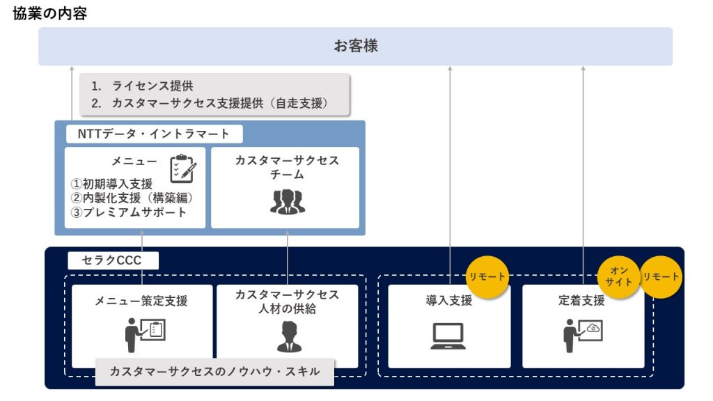 セラクCCC、NTTデータ イントラマートと協業し、クラウドBPM領域に進出 ~システムの定着・活用に向けたノウハウと、カスタマーサクセス機能を加えた新メニューを共同開発~ 株式会社セラクCCC(東京都新宿区、代表取締役:宮崎⿓⼰、以下「セラクCCC社」)は、株式会社NTTデータ イントラマート(本社:東京都港区、代表取締役社長:中山 義人、以下「イントラマート社」)と協業し、イントラマート社のクラウド型ローコード開発サービス「Accel-Mart Quick」に、セラクCCC社のシステムの定着・活用に向けたノウハウと、カスタマーサクセス機能を加えた新メニュー「カスタマーサクセス支援サービス」を2023年10月1日から提供開始します。業務プロセスのデジタル化・自動化においても、企業自らがローコードでシステム開発を内製化できるよう伴走しながら支援することで企業のDX推進に貢献します。 協業の背景 セラクCCC社は、2013年より「カスタマーサクセスソリューション事業」として顧客管理(CRM)、営業管理(SFA)、マーケティングオートメーション(MA)をはじめとするクラウドシステムの運用・定着化支援事業を行っており、在籍する300名以上のクラウド人材が400社以上の顧客企業に対しクラウドシステムの運用・定着化を支援しています。セラクグループとしても、クラウド型統合人事システムCOMPANYの導入・定着化支援や、Microsoft Power Platformなどのローコード開発に注力しています。 2021年からの株式会社NTTデータとの協業が大きく加速したことを起点に、イントラマート社のAccel-Mart Quickの新メニュー「カスタマーサクセス支援サービス」の共同開発に至りました。 協業の内容 ■カスタマーサクセスサービスのメニュー開発 イントラマート社のAccel-Mart Quickは、プログラミング知識がない方でも簡便な業務用アプリケーション開発を可能とするクラウド型ローコード開発サービスです。新メニューでは、サービス導入後の着実なシステム定着と成果創出を目的に、セラクCCCのクラウドシステムの定着・活用促進の過去実績に基づく知見から共同開発した「カスタマーサクセス支援サービス」を提供します。 本サービスでは、①初期導入支援、②内製化支援(構築編)、③プレミアムサポート(定着編)の3つのプランを用意しており、マスタ設定やサンプル提供だけではなく、初回ヒアリングやQ&A対応、運用開始後の定期打ち合わせも完備しているため、早期プロジェクトの立ち上げと同時に組織の自走を実現します。一方で、自走しきれないお客様にはセラクCCC単独での導入支援、オンサイトを主とした定着・活用支援を提供します。(下図参照) ■カスタマーサクセスチームの体制構築 今回イントラマート社が提供するAccel-Mart Quickはサブスクリプションモデルであり、初期オンボーディングからその後の定着支援を担うカスタマーサクセス機能が重要です。新たなクラウドシステムの提供にあたってカスタマーサクセス機能・組織開発は課題としてよく挙げられていることから、体制構築にあたってはコンサルティングとプロジェクトリードを担うサクセスマネージャーから設計・実装・トレーニングを担うサクセス担当までセラクCCCのメンバーから構成されています。 今後の展望 「Accel-Mart Quick」に加え、イントラマート社が提供するローコード開発プラットフォームによる業務プロセスのデジタル化・オートメーション化に伴走するBPM人材100名の育成を目指し、企業の事業成長に貢献します。 株式会社NTTデータ イントラマート 代表取締役社長 中山義人様のコメントこのたびの「カスタマーサクセス支援サービス」のリリースを心より歓迎いたします。ビジネス環境や顧客ニーズが多様化する昨今、弊社の強みでもあるローコード開発に加え、システムの運用・定着化を伴走型でサポートすることでサービス導入後の着実な成果創出を実現し、多くの企業が取り組むDX推進に大きく貢献できるものと確信しております。今後もセラクCCC様との協業を深めながら、企業の事業成長のスピードをさらに加速する製品・サービスの提供に努めてまいります。 ■株式会社NTTデータ イントラマートについてhttps://www.intra-mart.jp/株式会社NTTデータ イントラマートは、Web システム構築のための商用フレームワーク製品「intra-mart®」の開発および販売を中心に事業展開しています。1998 年より、当社が企画、開発した独自のシステム開発フレームワーク、業務コンポーネント群、アプリケーションシリーズは、2023年3月末現在9,500社を超える企業へ導入されており、200社以上のパートナーと共に、システム構築、コンサルティング、教育、運用支援に至るまでのトータルソリューションを提供しています。 株式会社セラクCCCについてhttps://www.ccc.seraku.co.jp/ 株式会社セラクCCCは、Salesforce社各種製品の定着・活用支援を担うカスタマーサクセスソリューション事業としてSalesforceをはじめとするクラウドシステムの運用・定着化支援事業を行っており、在籍する300名以