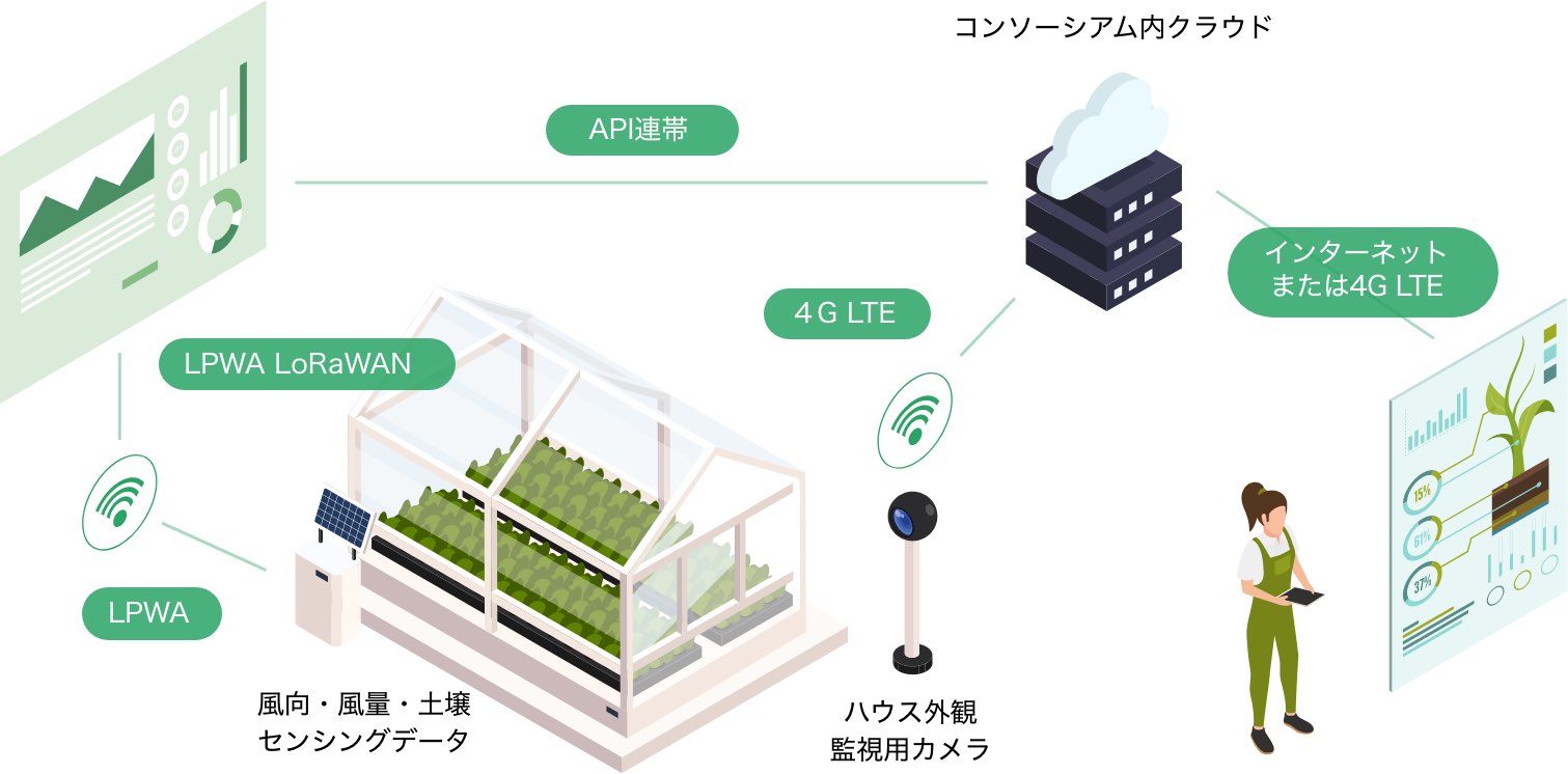 みどりクラウド※1利用時のオプションとして提供しているプライベートLoRaを搭載した無線化キット※2をカスタマイズすることで、LoRaWANに対応。プラットフォームに蓄積されているデータをLoRaWAN経由で、APIを介してみどりクラウドに投入することで、みどりモニタ※3を用いた農業データ活用を実現しました。