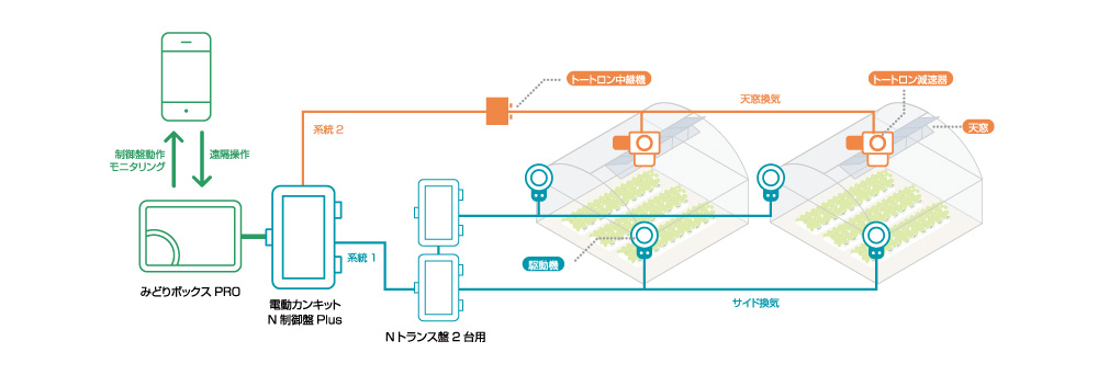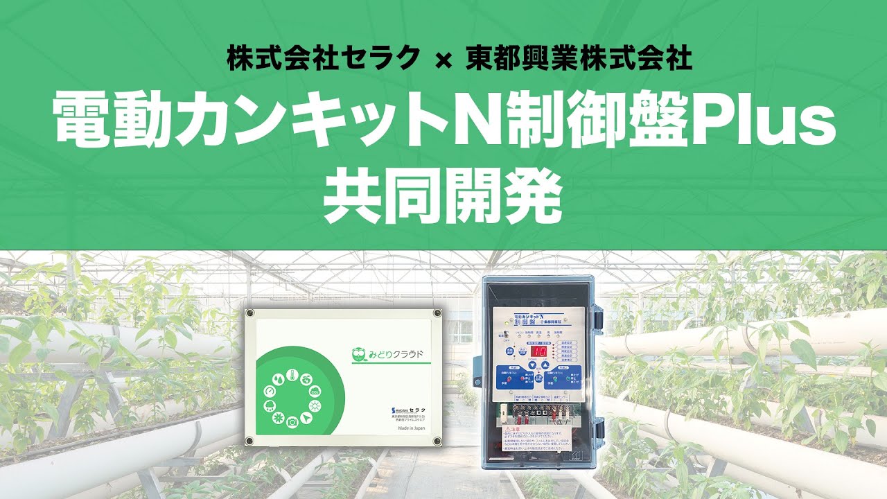 『電動カンキットN制御盤Plus』は、当社の開発したハウスの自動換気装置『電動カンキットN制御盤』とセラクさんの『みどりクラウド』を連携し、遠隔地からビニールハウスの温度モニタリングと換気操作をするシステムです。