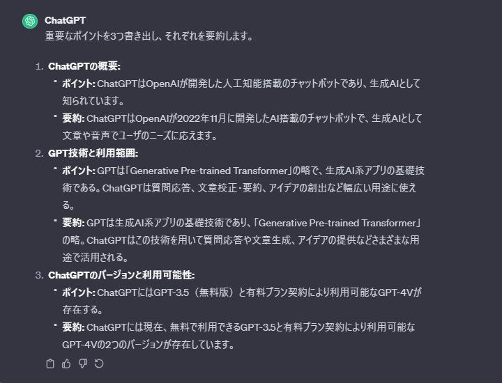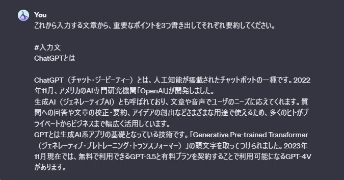 ChatGPTは膨大な情報から要点を抽出し、短い文章にまとめてくれるため、短時間で必要な情報だけを手軽に把握できます。また、文字数の指定や文章をポイントに分けて要約しすることも可能です。以下で具体例を紹介します。