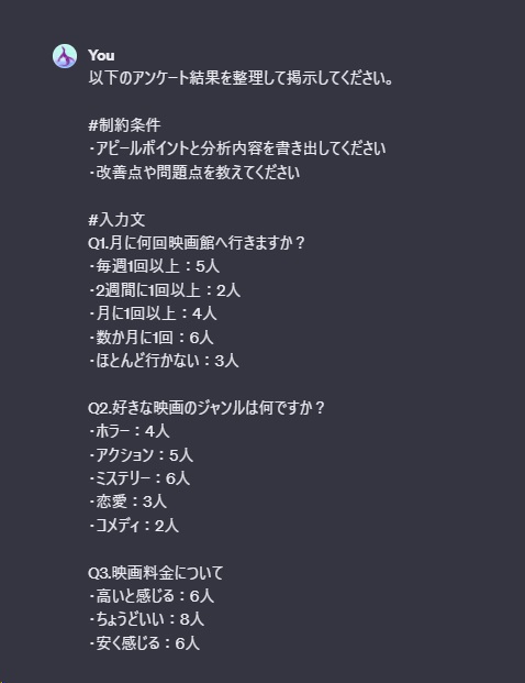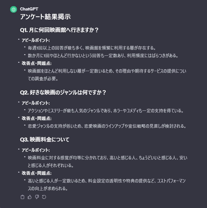 ChatGPTは複雑なデータを理解したうえで結果をわかりやすく解説し、データの分析も自動で行うため、分析に費やす時間を大幅に削減できます。たとえば、顧客の声を集計・分析し、商品やサービスの改善点を発見するという使い方が可能です。以下で具体例を紹介します。