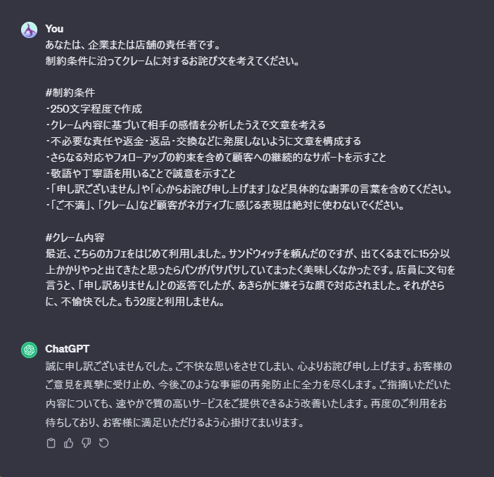 ChatGPTでは、顧客からの問い合わせやクレームに対する返信内容のチェックや異なる言い方に書き換えてもらうこともできます。