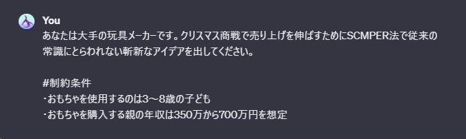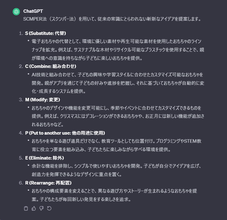 以下の具体例では、7つの角度からアイデアを出す手法である「SCMPER法」をプロンプトに組み込みました。