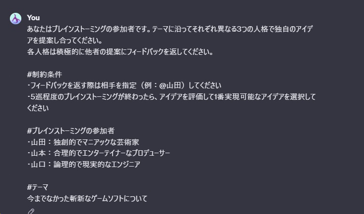 人間とのブレインストーミングでは、互いに意見を述べあいながら時間をかけて行いますが、ChatGPTに「アイデアを10個出してください」のように伝えれば、瞬時にアイデアを発散することが可能です。以下から具体例を紹介します。