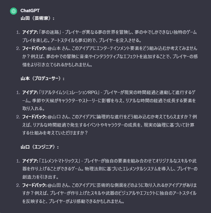 ChatGPTは、人間では思いつかなかった新たな視点から独創的なアイデアを提案します。常に現実的で新しいアイデアを出してくるとは限りませんが、複数の視点から提案するように指示できるため、視野を広げ、新たな可能性を発見するきっかけになります。