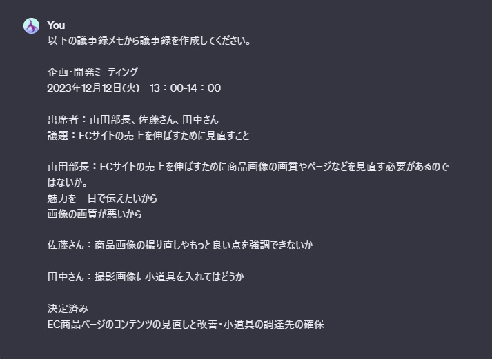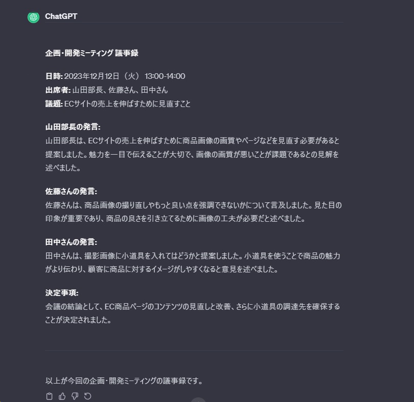 ミーティングは必要不可欠ですが、議事録を作るには時間も労力もかかる業務のひとつです。そこでChatGPTにミーティングの内容を入力すれば、それをもとに議事録を作成してくれます。以下で具体例を紹介します。