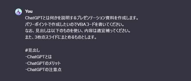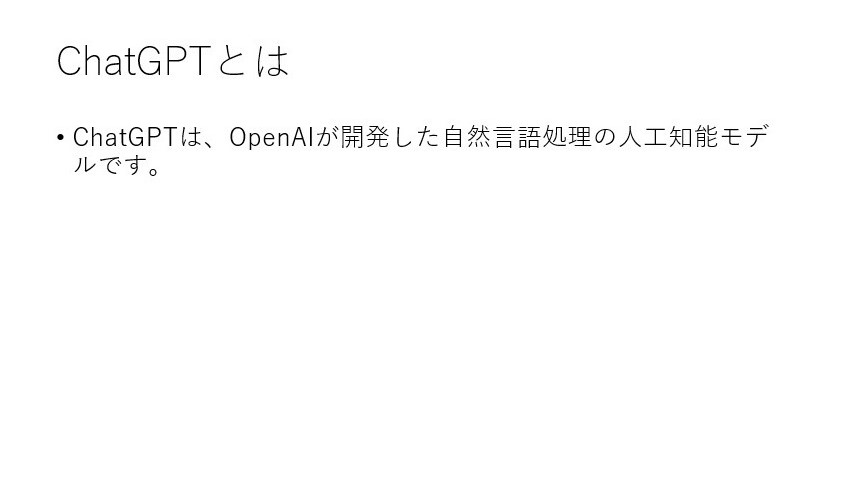 プレゼンテーションの作成も重要な業務ですが、その内容を考え、整理し、プレゼンテーションにわかりやすくまとめるのは容易ではありません。そこで、伝えたいことをChatGPTに入力すれば、それをもとに鮮やかなプレゼンテーションを作成します。