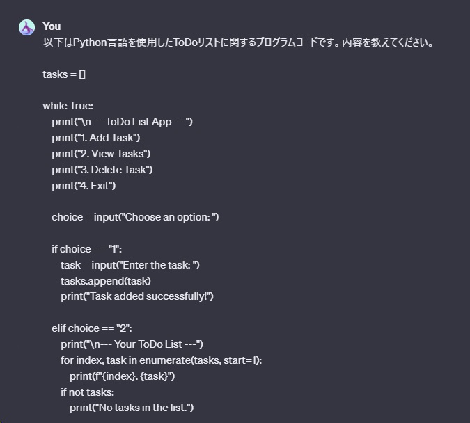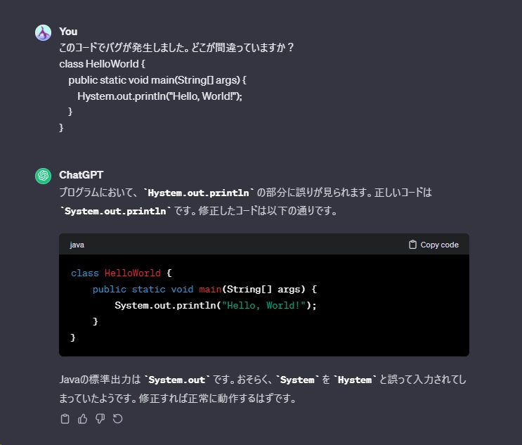 プログラマーは正確なコードを書くことが求められますが、どれだけ確認を行っても人為的なミスは起こってしまうものです。ChatGPTに書いたコードを入力すれば、それがどのように動くのか理解し、コード内のミスや修正のためのコードを提案します。 以下で具体例を紹介します。