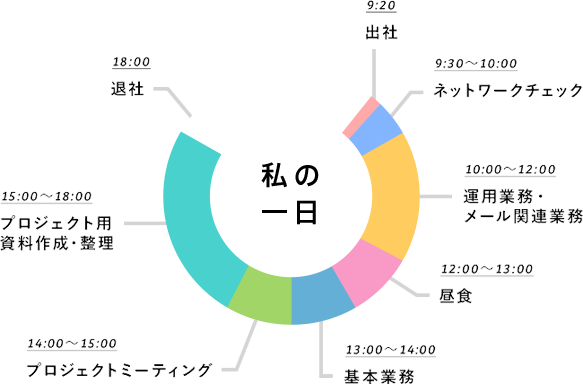 出社後にまず行うのはメールチェック及びネットワークのチェックです。午前はメールについての業務遂行がメインとなります。午後からは、プロジェクトの資料整理やミーティングが中心。たまに突発的な依頼もあるので、毎日気が抜けないことが多いです。臨機応変に対応できるよう時間に余裕をもって行動しています。基本的には残業は行わず定時の18時には退社し、明日のために心身を休めることを大切にしています。