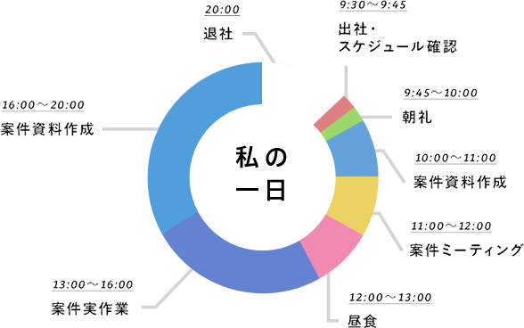 現在の常駐先はゆっくり出勤です。メールのチェック/スケジュール確認をしてから業務に入ることで、仕事の漏れを防ぎます。実作業がある日は昼食が遅くなることもありますが、毎日1時間のお昼休憩でリフレッシュして、午後の業務に取り組んでいます。案件の進捗によって、帰りが遅くなることもありますが、平均20時くらいには退社し、職場の人と飲みに行ったり、家に帰ってゆっくりしたりとプライベートな時間を満喫しています。