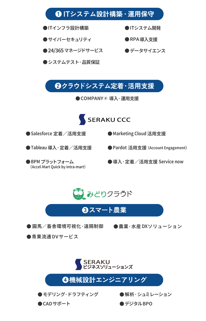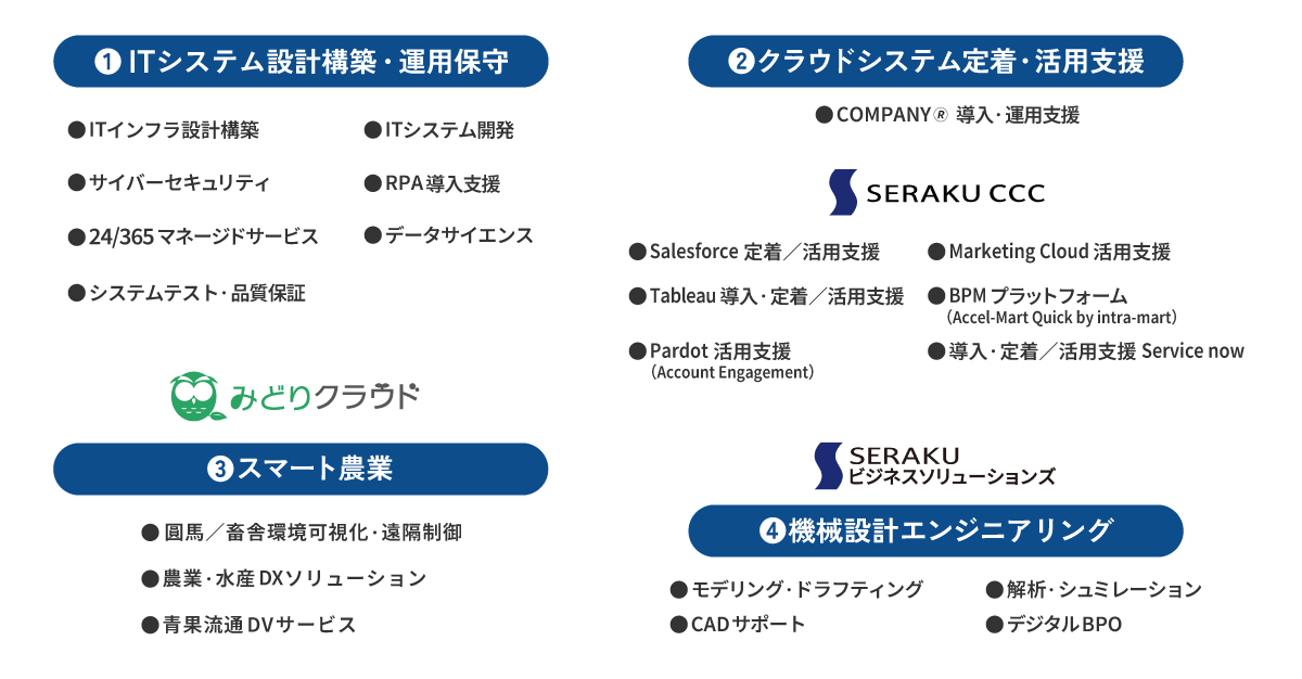 大きく4つのサービス①ITシステムの設計構築・運用保守②クラウドシステムの定着・支援③スマート農業④機械設計エンジニアリングを提供し、デジタルインテグレーションを推進しています。
