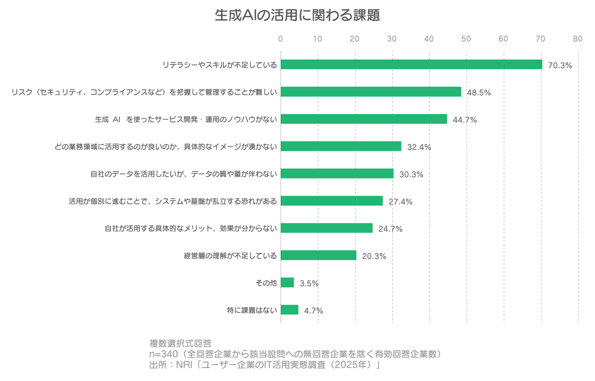 活用の壁として最も多く挙げられたのがリテラシーやスキルの不足(70.3%)です。前年度の65.4%から上昇しており、導入が進んだことで現場のスキル不足がより浮き彫りになっています。