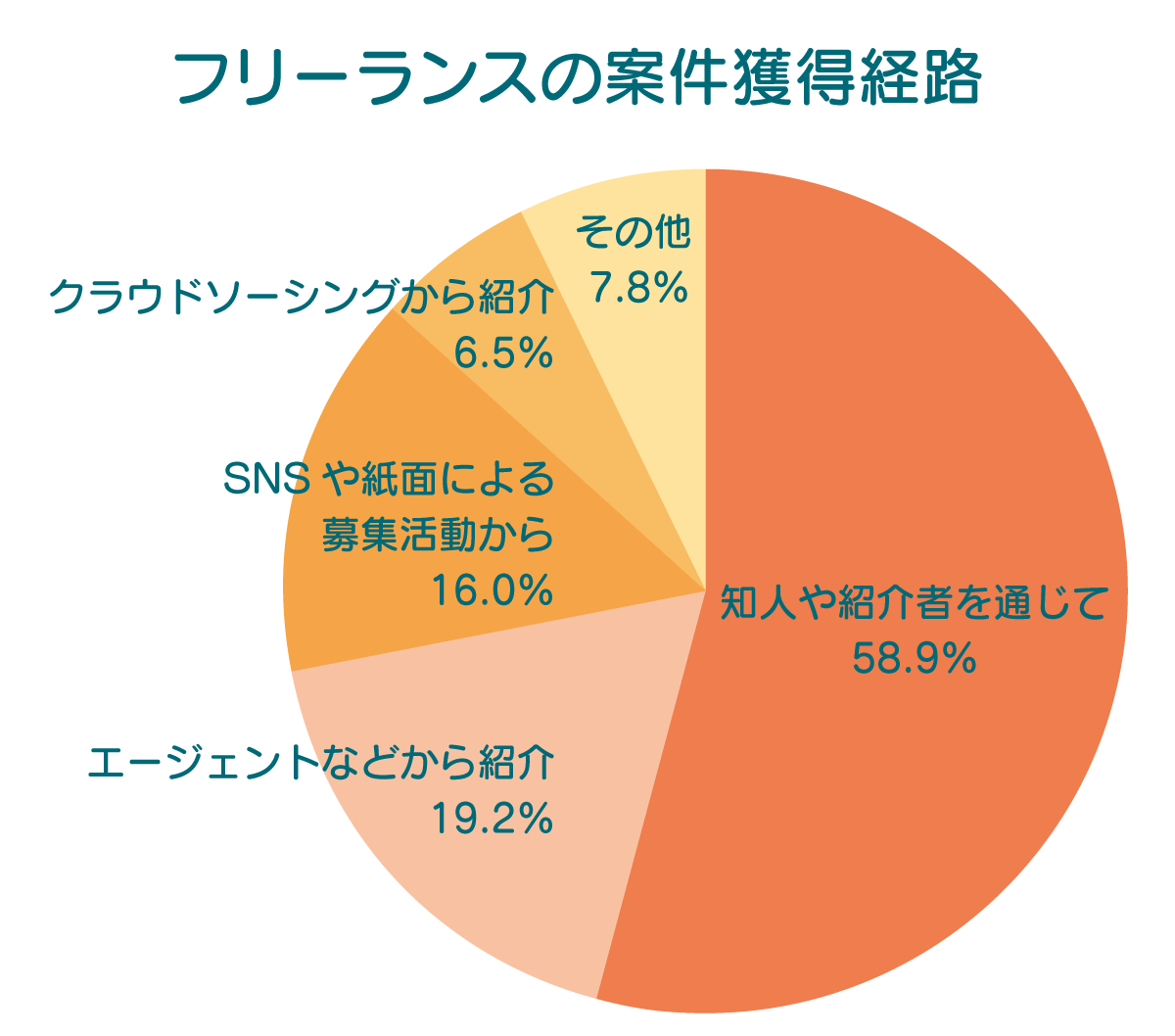 フリーランスエージェントやクラウドソーシングなどの求人や職業紹介サイトを活用したり、友人知人などの伝手を頼ったりして仕事を探します。営業が苦手な場合や、契約にかかわる諸手続きに不安があるなら、エージェントやクラウドソーシングの活用が便利です。