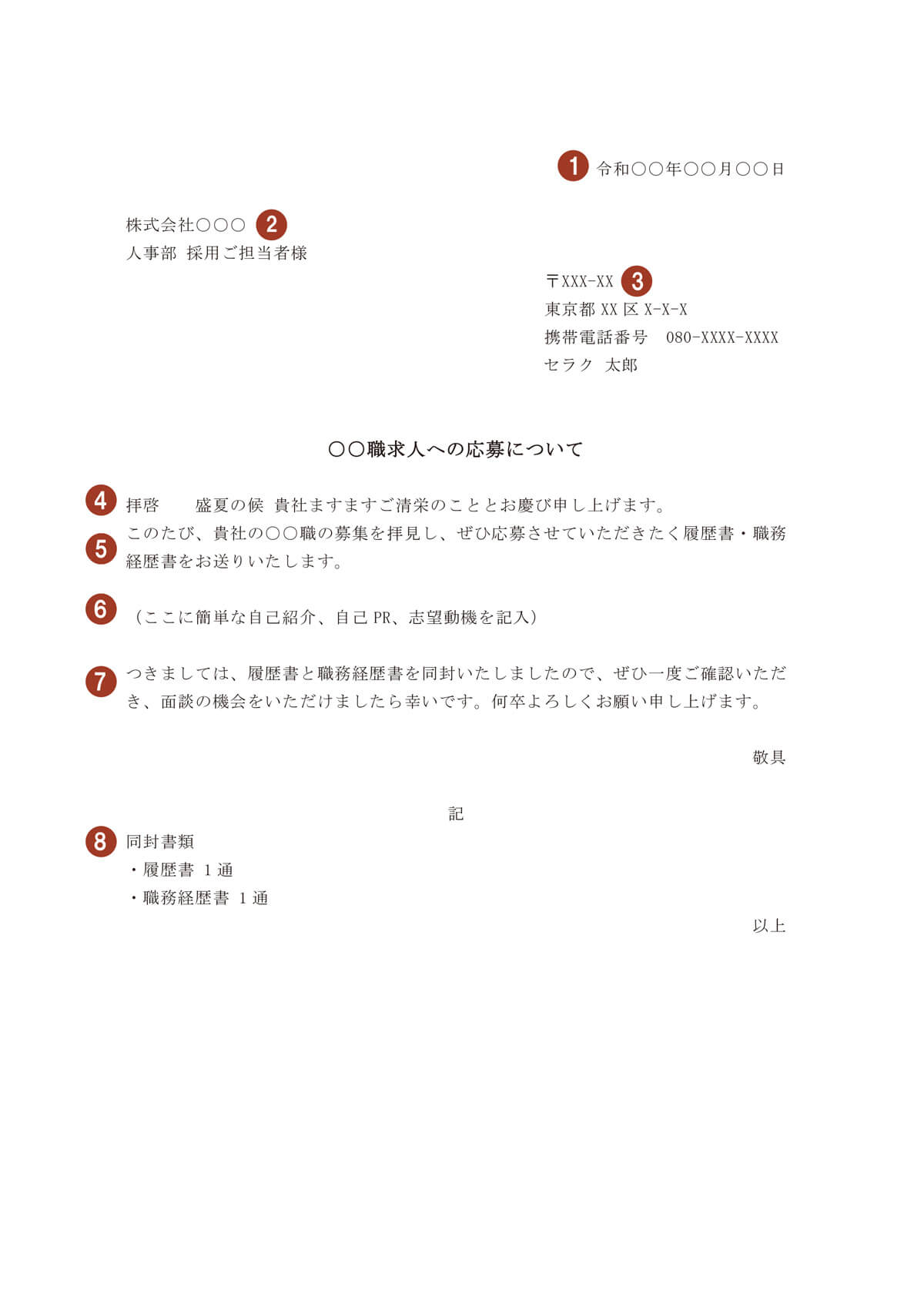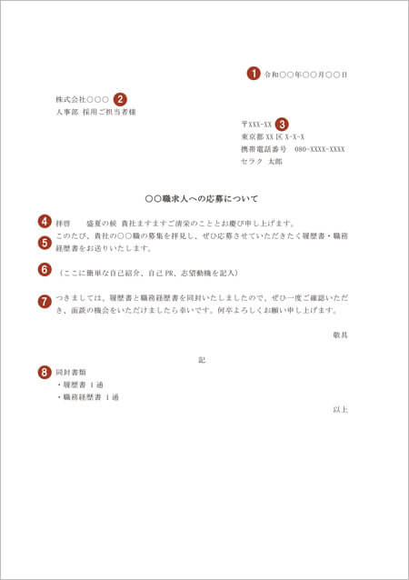- ❺ 応募の経緯 応募書類を送付する旨を一文で記載します。アルバイト(パート)の方は「アルバイト(パート)の応募書類を送付します」と書きましょう。求人募集を知った経緯として、媒体名を書くとより丁寧です。企業側が複数の職種を募集している場合は、自分の希望職種もあわせて書きましょう。