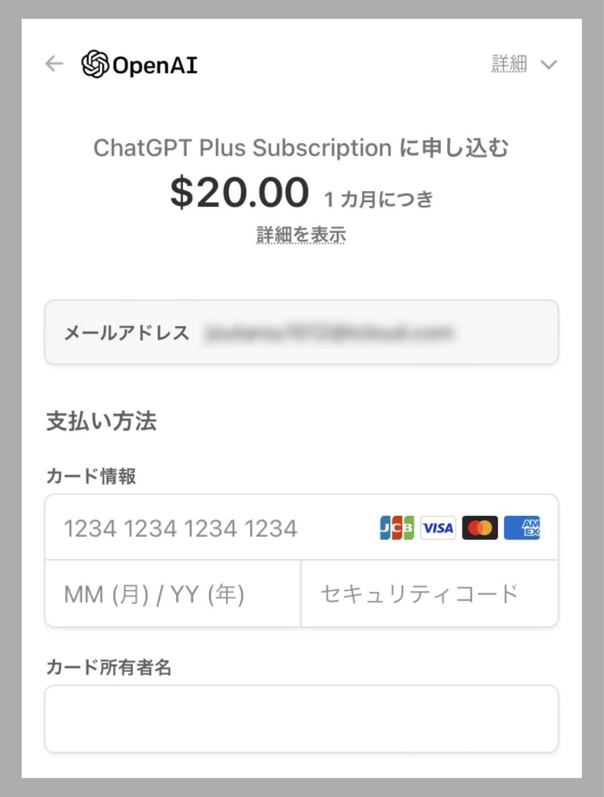 - 次の画面でクレジットカードの情報を入力し、申し込めば完了です。サブスクリプション方式なので解約しない限り毎月20米ドルが引き落とされるので注意してください。