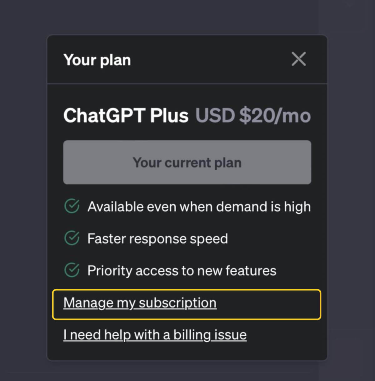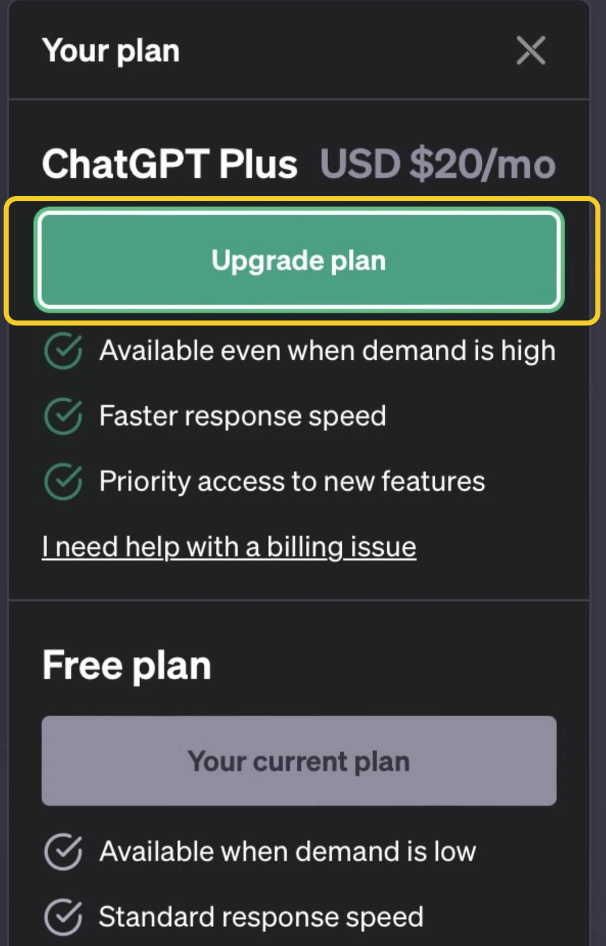 ChatGPT Plus(チャットジーピーティープラス)はChatGPTの有料版で、サブスクリプション方式となり月20米ドルの料金がかかります。支払い方法はクレジットカードのみです。有料版にすると、無料版にはなかったさまざまなメリットを享受できます。次の項にてそれぞれ解説するのでご覧ください。