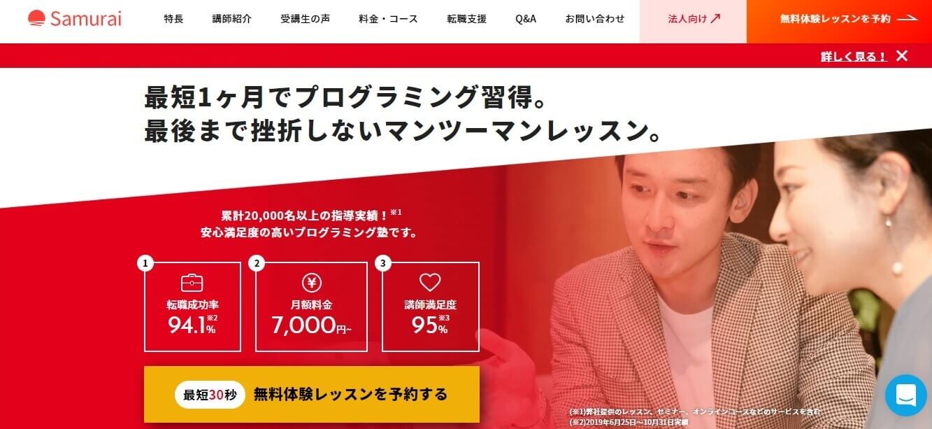 オンライン型のプログラミングスクールの中で実績あるスクールとして知られているのがCodeCampです。目的に合わせて様々なコースが用意されているので、学びたい言語や明確な将来像を描くことのできない人でも安心して受講できます。講師を選んで予約できるため、毎回同じ講師が良い人は成長度合いを見てもらうことができますし、複数の講師の異なる視点を知りたいという人なら、毎回違う講師を選ぶことも可能です。チャットサポート時間が朝7時〜23時40分と長いため、日中忙しい社会人におすすめです。