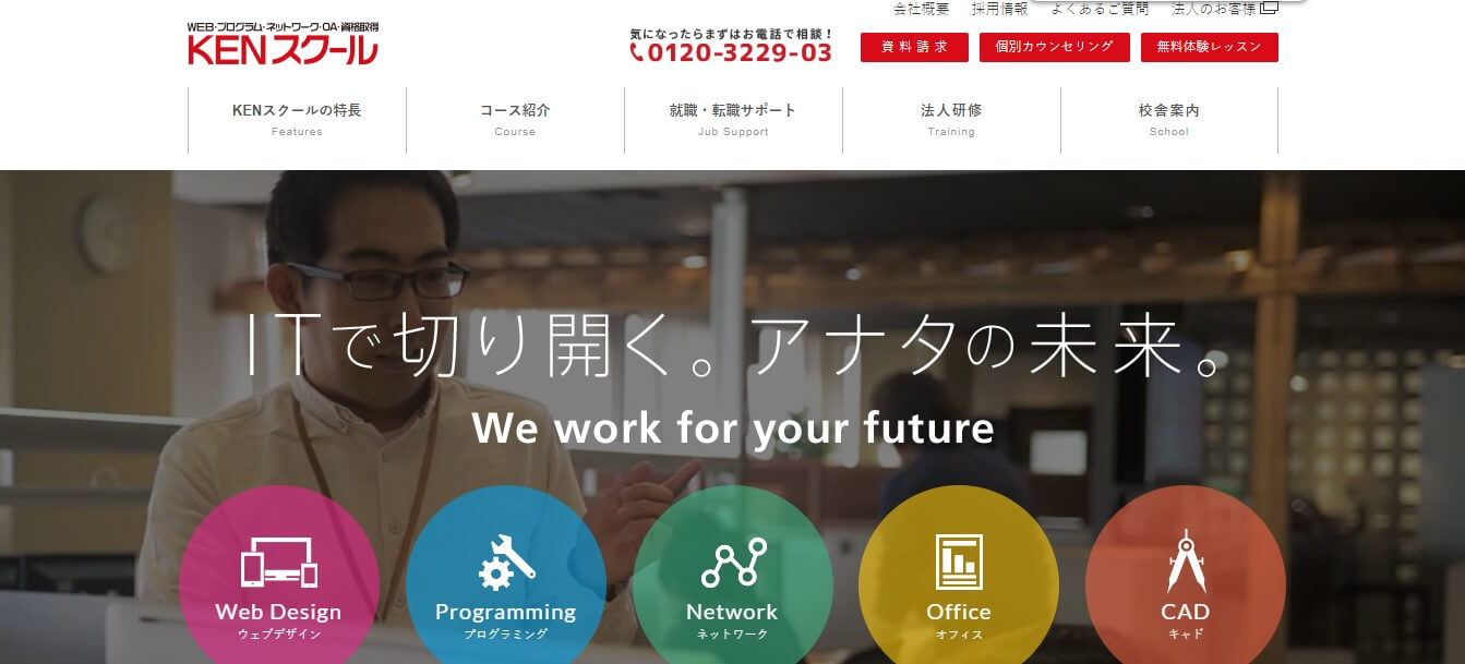 首都圏は新宿、池袋、北千住、横浜、名古屋、大阪、札幌、福岡など全国に展開しており、通学が必要なタイプのスクールです。KENスクールはWeb・DTPデザインコース、プログラミングコース、ネットワークコースなどの複数の講座を持っています。