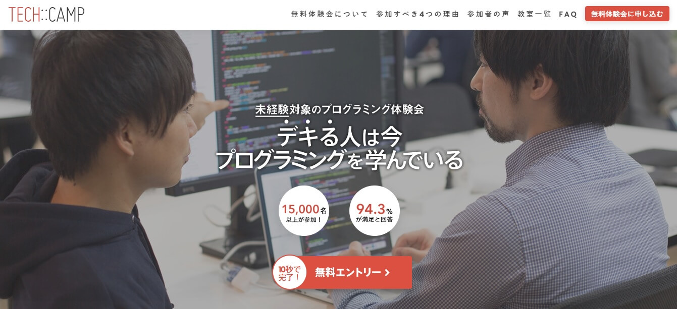 オンラインで完結するスクールです。多様なコースがあり、ブロックチェーンやAIなどの先端技術を学ぶこともできます。チャットサポートの対応時間は15〜23時なので、仕事終わりに学びたい人にぴったりです。オンラインスクールでも週に2回、現役エンジニアのメンターとのオンライン上の面談があるため、一人で勉強するのに自信がない人でもモチベーションを維持できます。TechAcademyには無料体験がありますので、雰囲気を知りたい人は利用してみると良いでしょう。