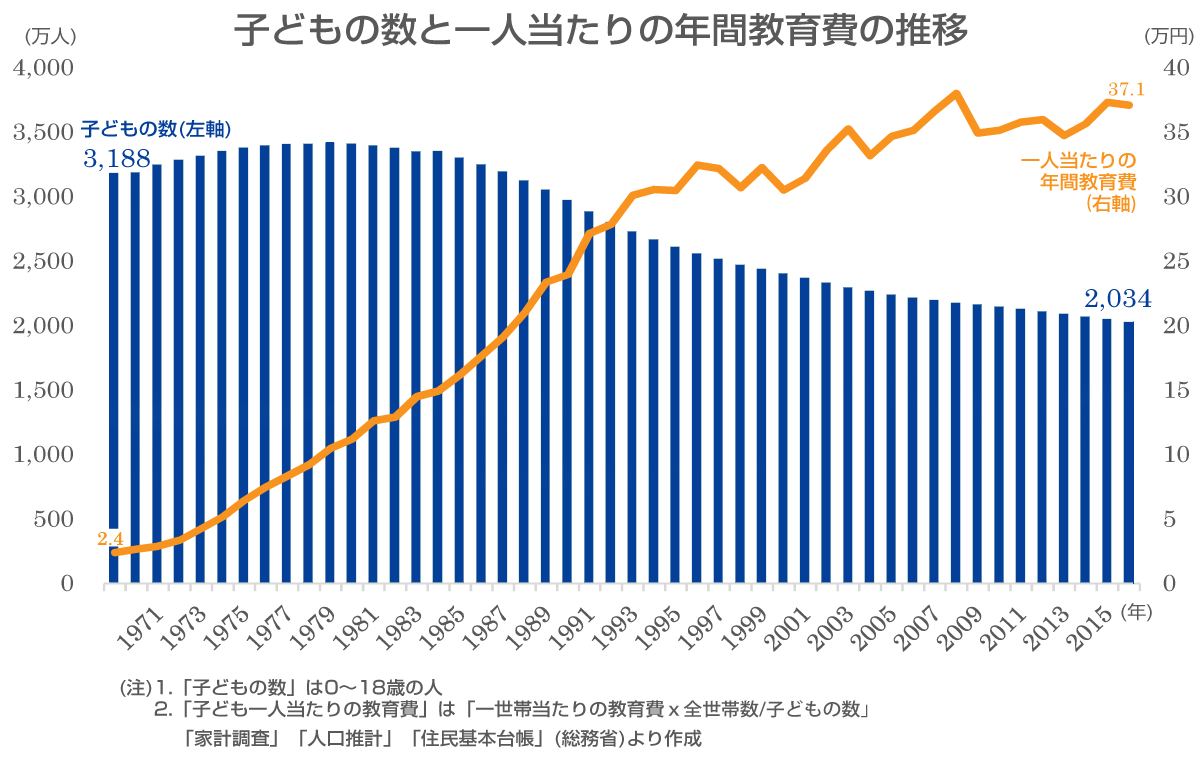 上のグラフで明らかなように、ここ数十年、子どもの数と子ども1人当たりの年間教育費は反比例しています。子どもの数はなかなか増やせないけれど、教育費は惜しまないという傾向が読み取れます。