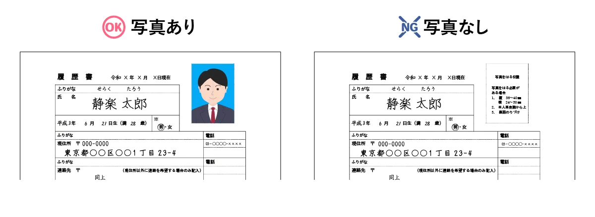 アルバイト用の履歴書では写真を貼らない人もいるようですが、会社側から不要と明確に案内されていない限り、基本的には貼るのが無難です。プリクラやスナップ写真はもちろんNGです。